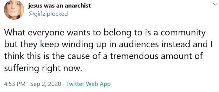 People want a sense of belonging, they want their needs met, they want to feel special, and corporations are happy to oblige with transactional versions of these things. But a customer is at most an audience member, one whose status relies on ongoing payment. See how long your sense of belonging lasts at Target or an Apple store or a pro sports game (also corporations, heavily subsidized ones) without handing over money. Those with means can keep up the illusions of commercialized "relationships." Those without means feel excluded from participating in what has become a primary American identity: consumer.